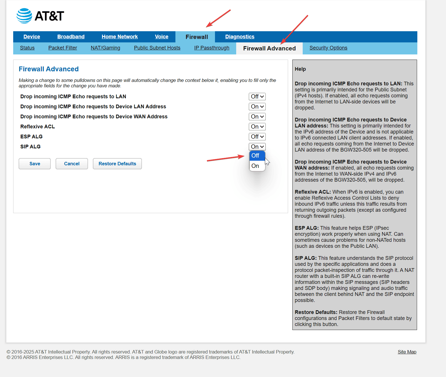 FirewallDisabling SIP-ALG is an essential part of configuring the firewall on your router and optimizing it for IP 1 Services. Many ALGs (including Cisco's) have bugs which cause call flow and registration failures. Some ALGs (including Cisco's) intermittently miss some packets, or in the case of fragmented packets, do not even examine and change headers.